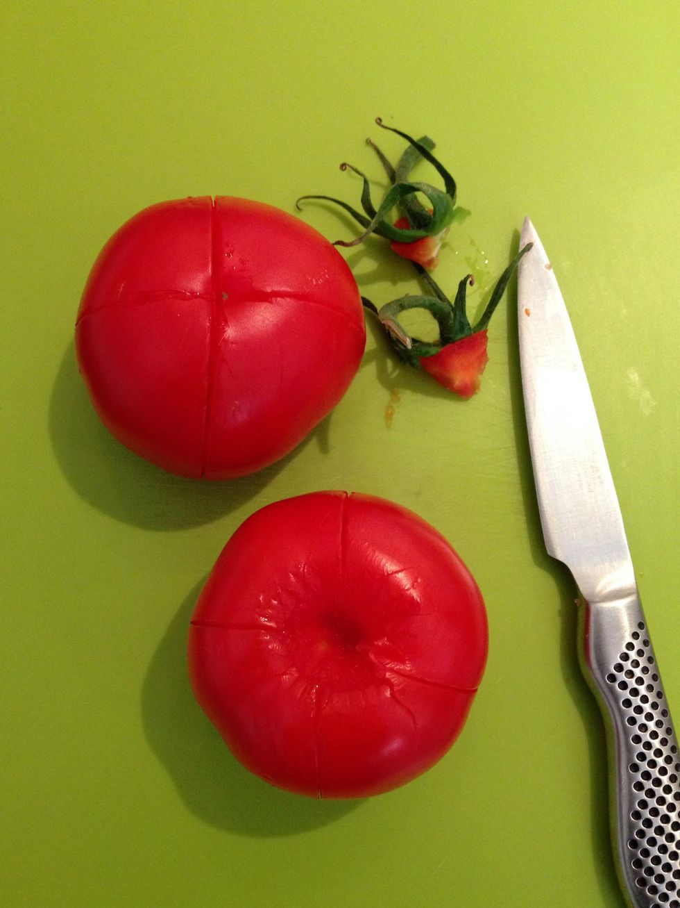 That is all what you needPut the water to boil and prepare your tomatoesMake incisions quartered all the wayPut on the bowlPour the boiling water. Wait 30 seconds.Here you have peeled and seeded tomatoes. It takes maximum 5 mins from A to Z.