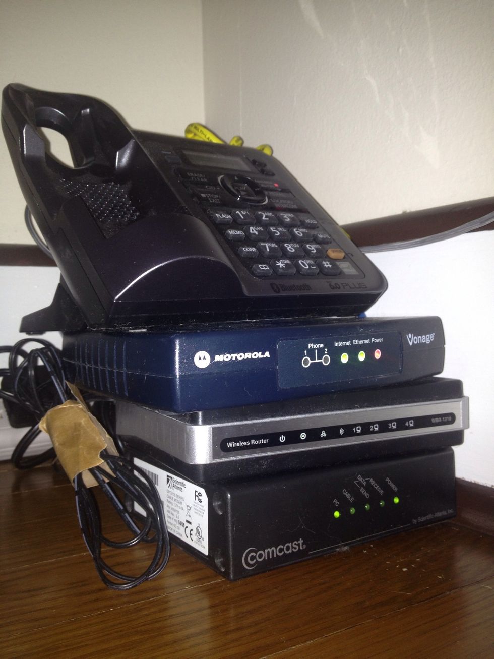 4) Find all cables pertaining to a device, and mask-tape them to the box (box in picture is labeled "wireless router") Do this to all devices