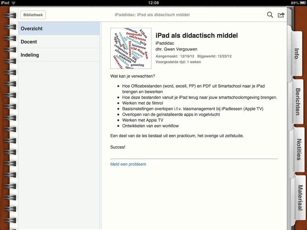 Als je de iPad horizontaal houdt, zie je rechts de verschillende rubrieken. Tap op materialen en je krijgt een overzicht van de leerinhouden netjes gerangschikt volgens type.