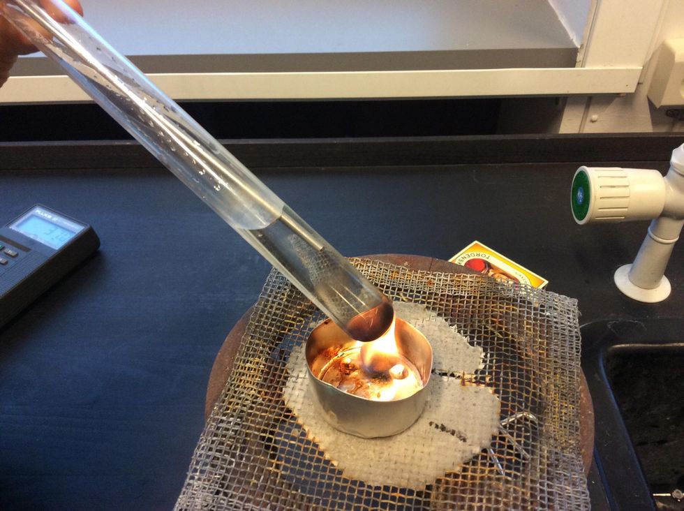 Reagensglasset holdes hen over den brændende peanut, og temperaaturen måles løbende. Sluttemperaturen af vandet da vores peanut var brændt op: 68,6 grader