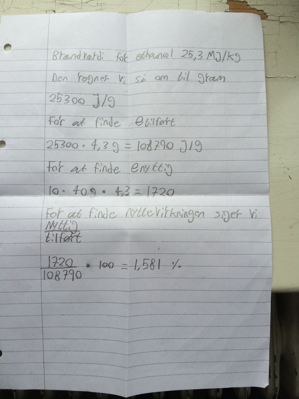 Vi fik vores nyttevirkning til at være 1,581% men der må være en fejl, for det er en meget lav nyttevirkning. Fejlkilder: vinduet stod åbent imens vi foretog forsøget, og derfor ramte flammen ikke.