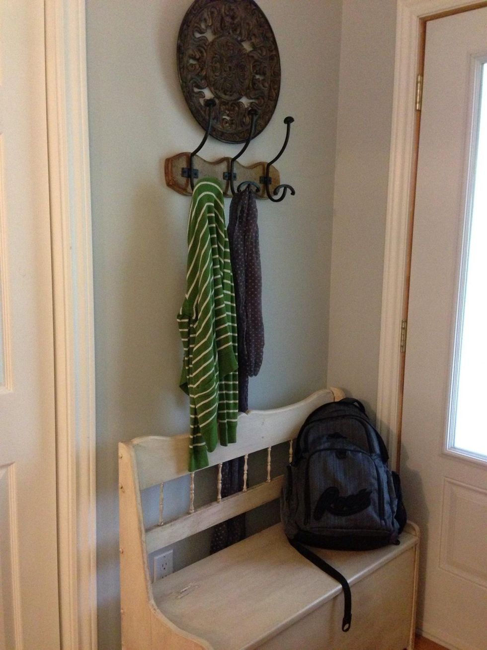 A bench for storage. Use the inside for umbrellas, mittens, hats...the outside for bags. Hooks on top for coats, scarfs...Hang an artwork on top of the hooks to embellish and capture the guest's eyes.