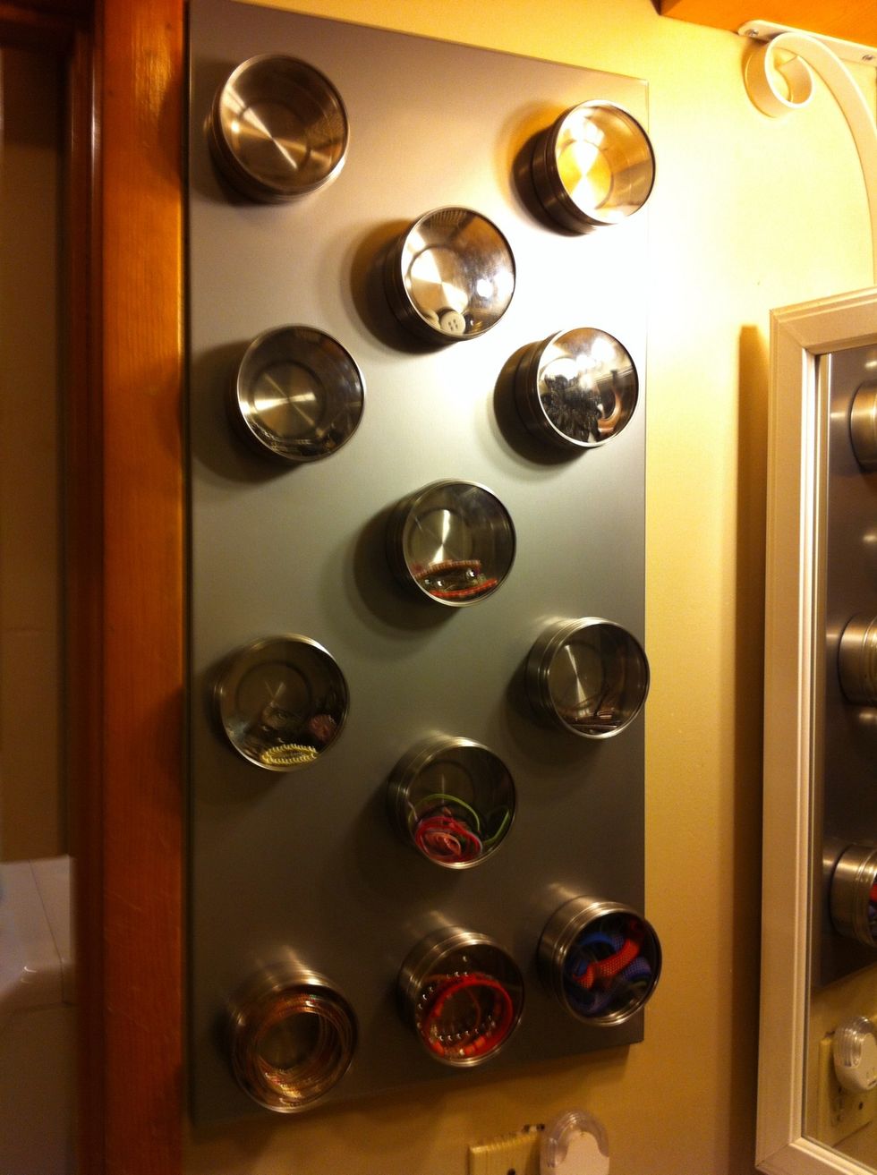 As you can see, the containers can just be placed on the board. These both are sold at IKEA in the kitchen section for spices.