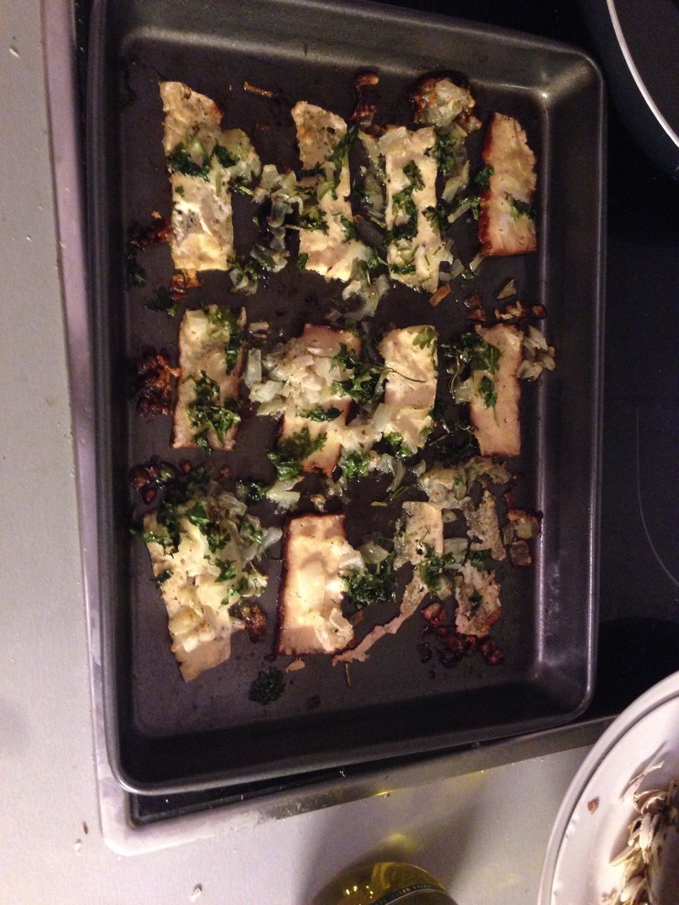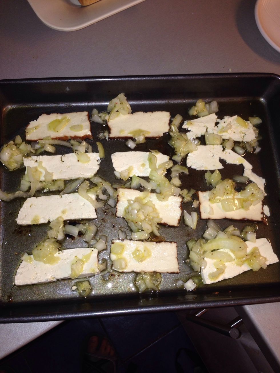 Stir the mixture well, so all in incorporated. Thinly slice the tofu and place on the backing tray. Add the oil mixture to the tray by spoon (it should not be runny!!)