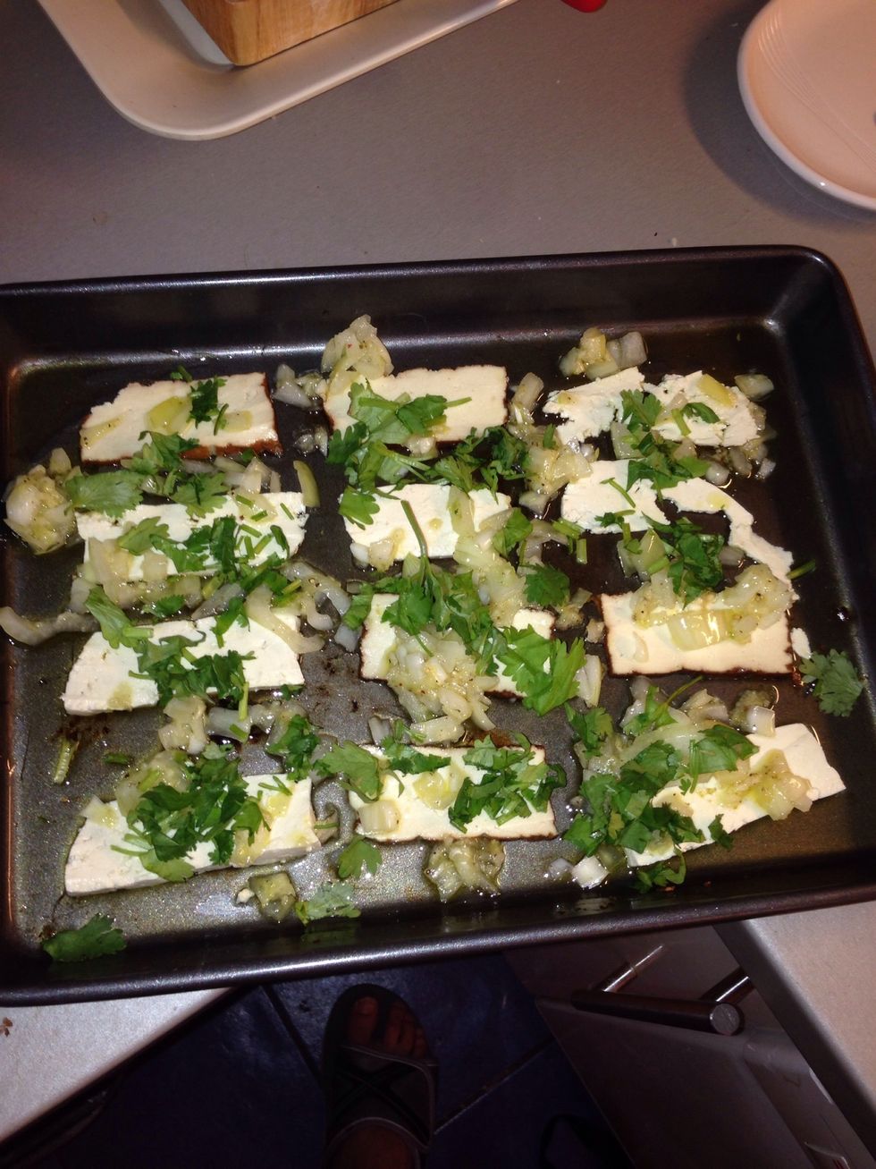 Chop the coriander and sprinkle evenly over the tofu. Take the remaining salt and pepper and spread evenly. Place the tray on the top shelf of the oven for 12-15 mins, or until the tofu is browned.