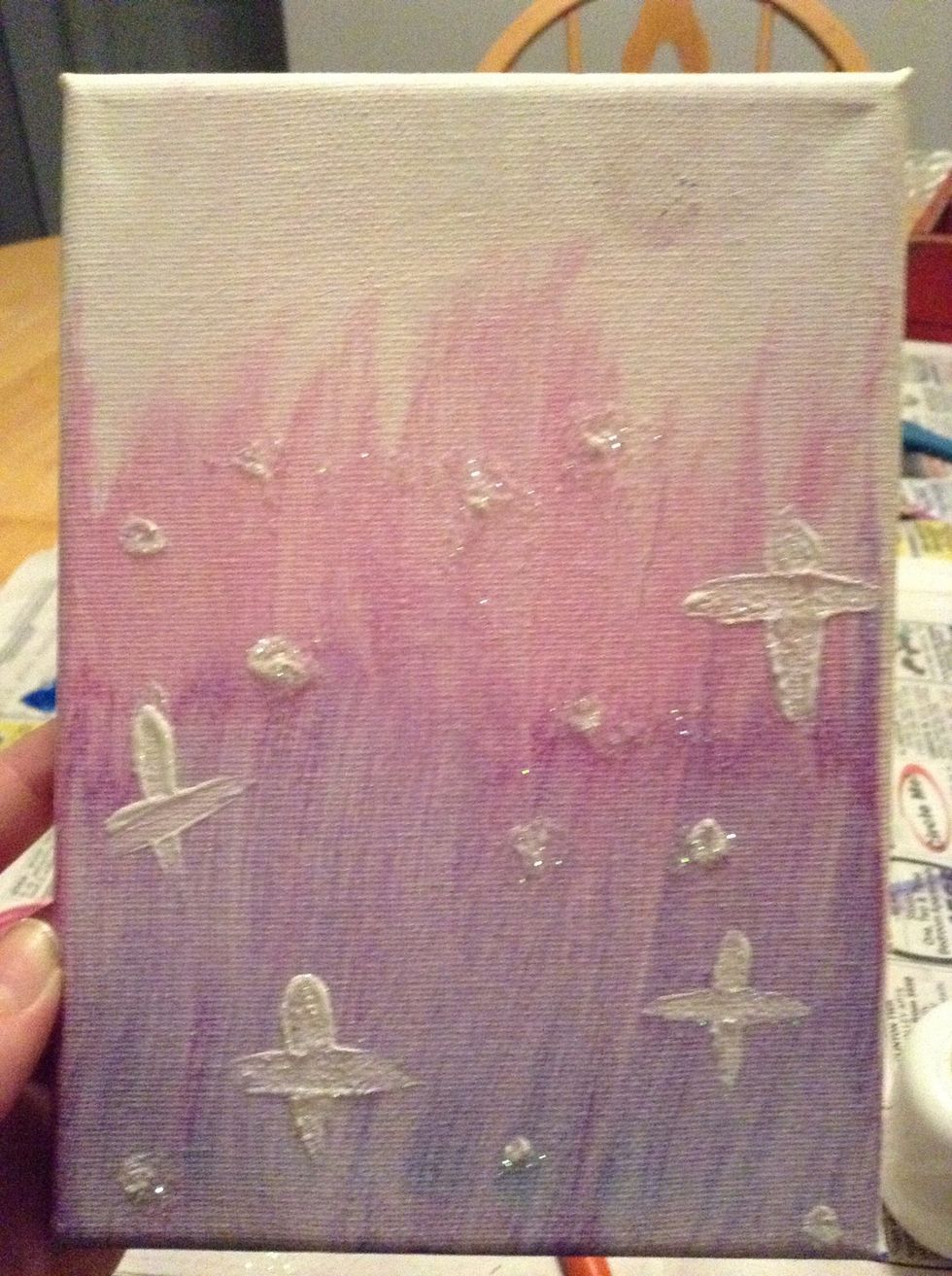 Supplies: blue, purple, pink, and white acrylic paint, mini canvas, angled brush, 1 inch brush