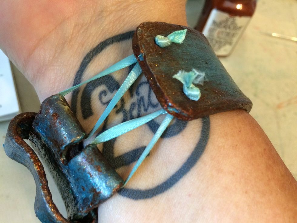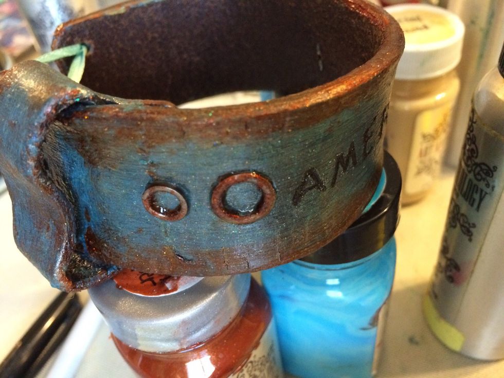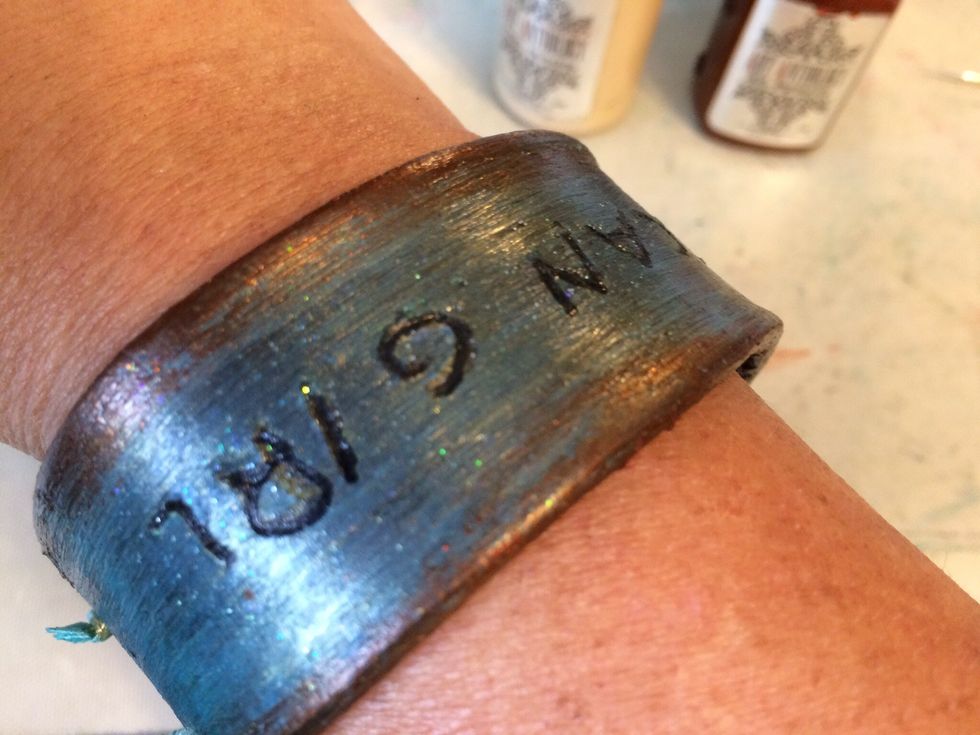 I had the stamps that were made to stamp metal, so it didn't turn out that good. Next, I punched holes out of the end of the bracelet.