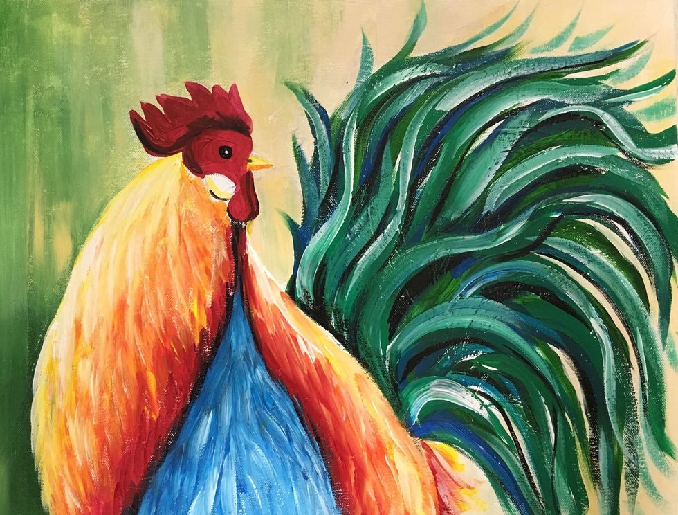 I used vertical brush strokes and blended the darker green near the chest of the rooster and the lighter colors near the tail feathers. It's okay to over lap you drawing as it can be covered up later.