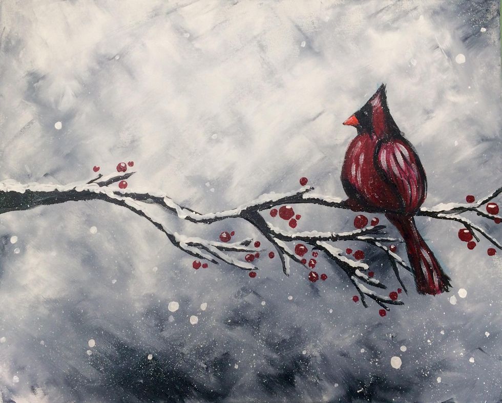 Add snow to the branches with the same small brush and white paint. I also added a little white speck to the berries and some white texture to the cardinals feathers.