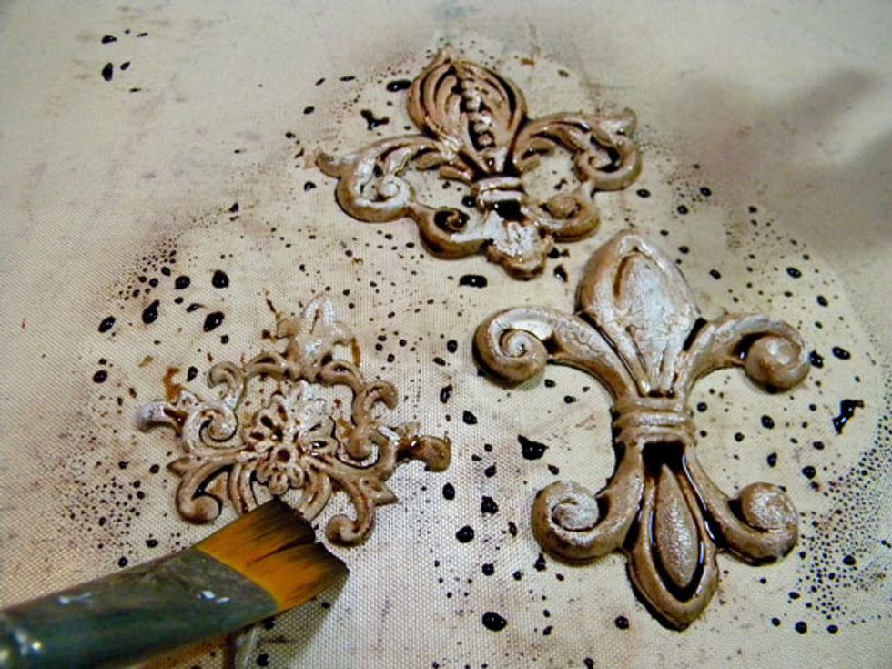 I want the Melissa Frances Appliques to look like worn pieces of iron or metal that I'd found at an antique store. So I painted gesso and Cotton Velvet randomly on each piece to start.
