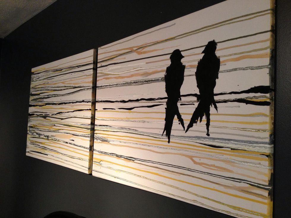 At the end of one canvas, paint a small circle and larger pointed oval underneath. Paint long black strokes and the end of the oval to make the tale feathers.