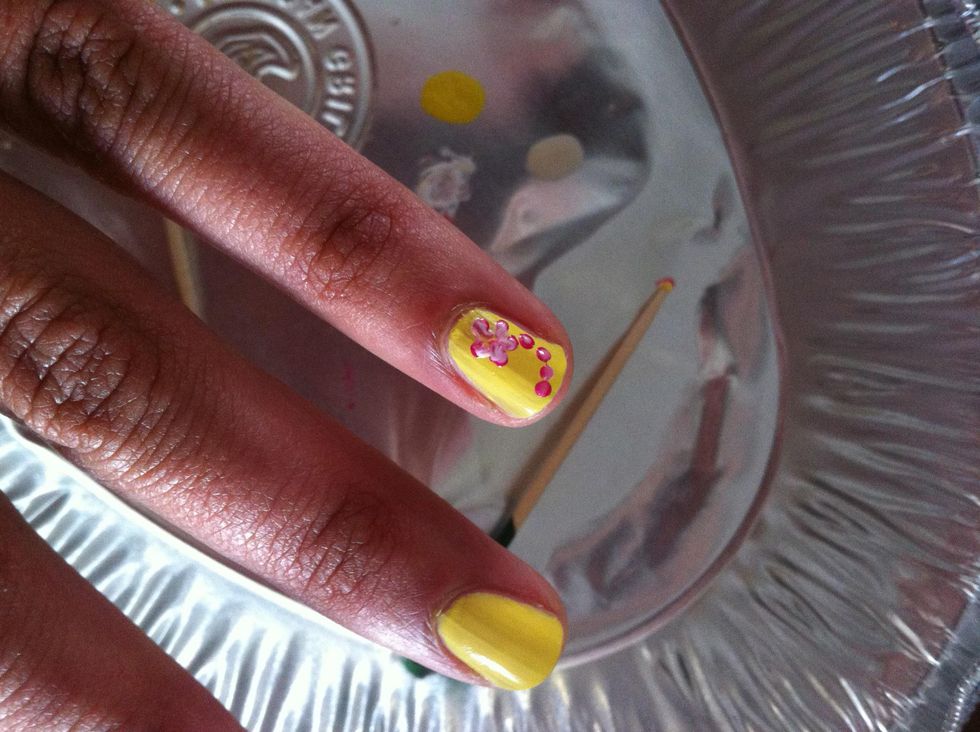 Dip the toothpick in nail polish and put five dots on your nail.Dip another toothpick in a different color. Dot on top of the first dots.You can also make a trail of dots from the flower to the edge of your nail.