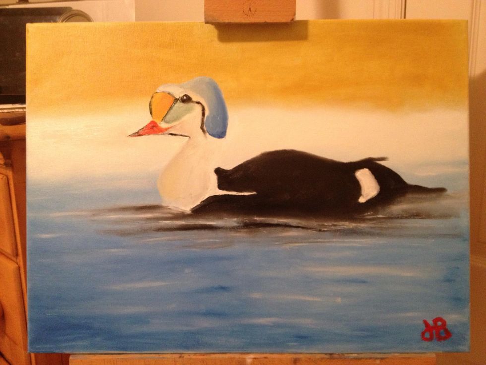 This is a male (drake) King Eiden, a large sea duck of the Arctic. Let's let him fly.