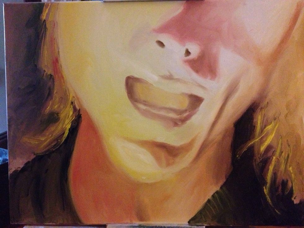 With a clean hand, I scrape a few ribs on the neck of the sweater. I start to add some shadow to the face. Clean the hand once more and add hair with yellows and reds.
