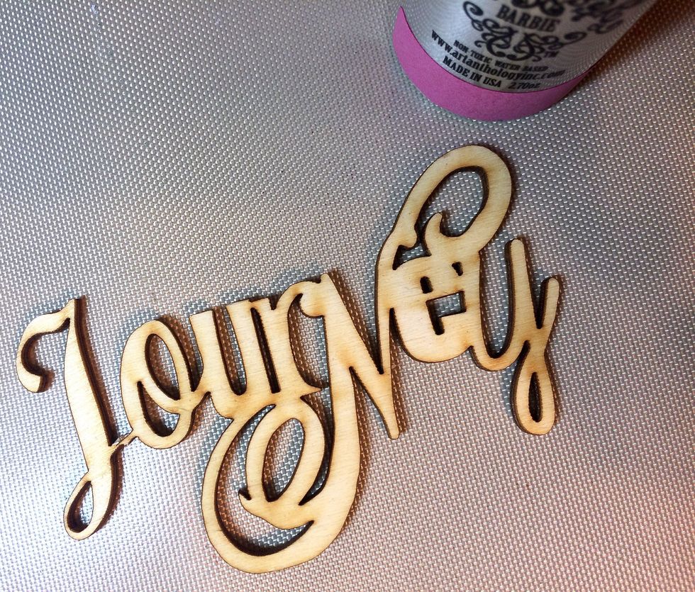 Now, I spray the "Journey" wood piece and spray it with Barbie Colorations Spray.