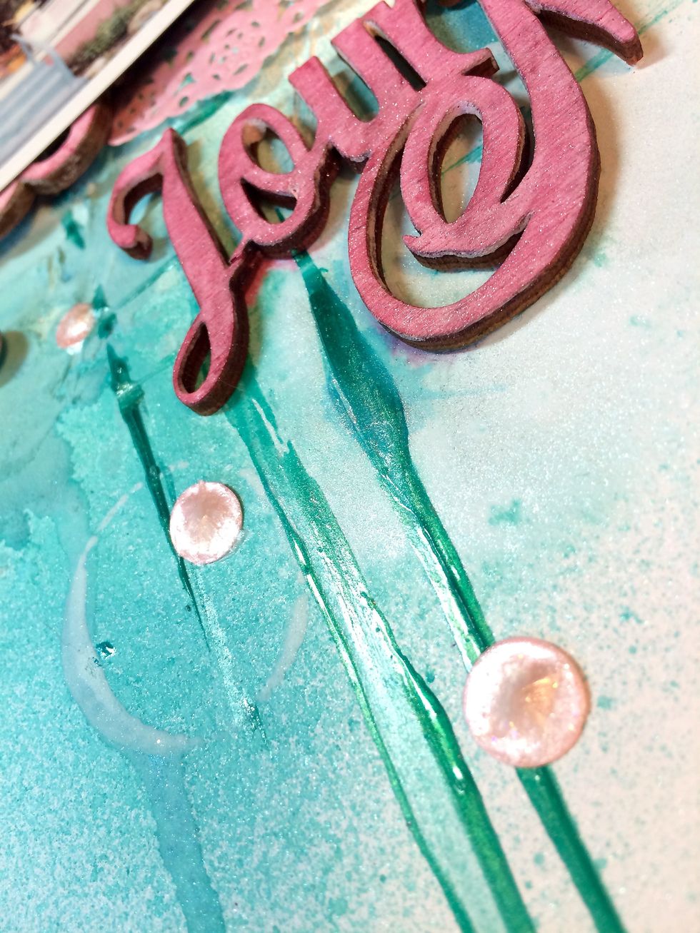 I, also, need a bit more shimmer to the layout, so I spray the Ice Fairy Dust Spray randomly onto the page.