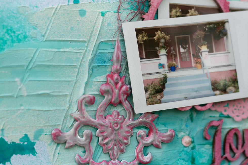 I have the pink elements ready for the layout. Now, it's time for the page, itself. I spray Siesta Key Colorations Spray over the Mud Texture Medium that I previously laid down.