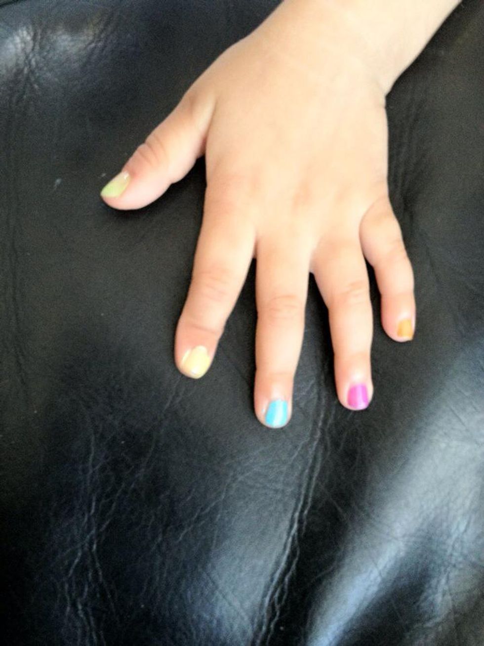 Rest her hand on a flat surface and get someone to distract her! LolStart painting from the little finger.Add different colours to each finger.Blow them dry!
