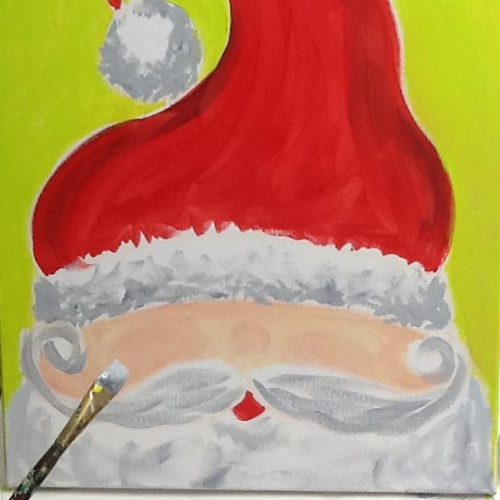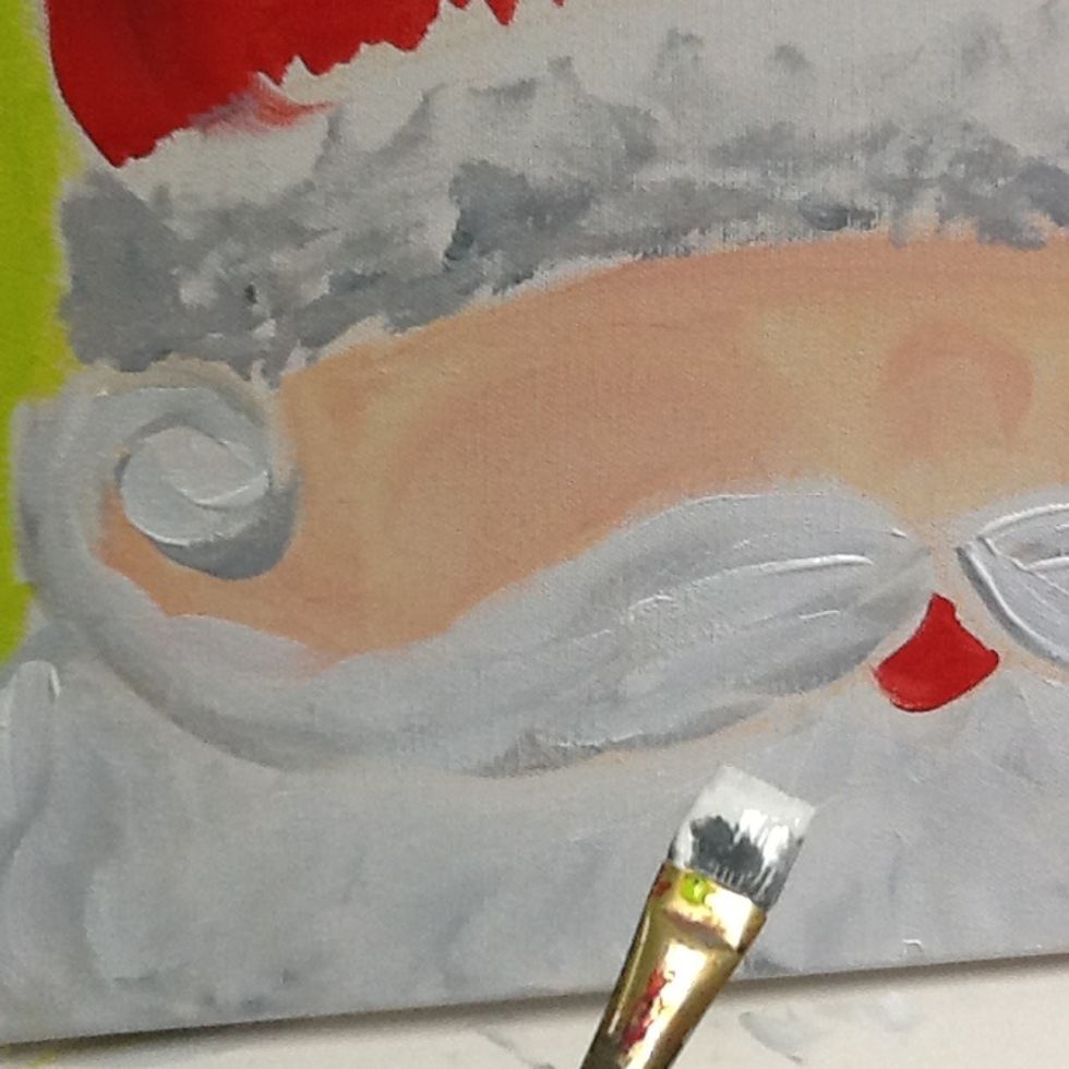 Then, while the grey is still wet, paint white over the beard, mustache, band of cap, and puff ball pressing your brush down in such a way as to add texture.