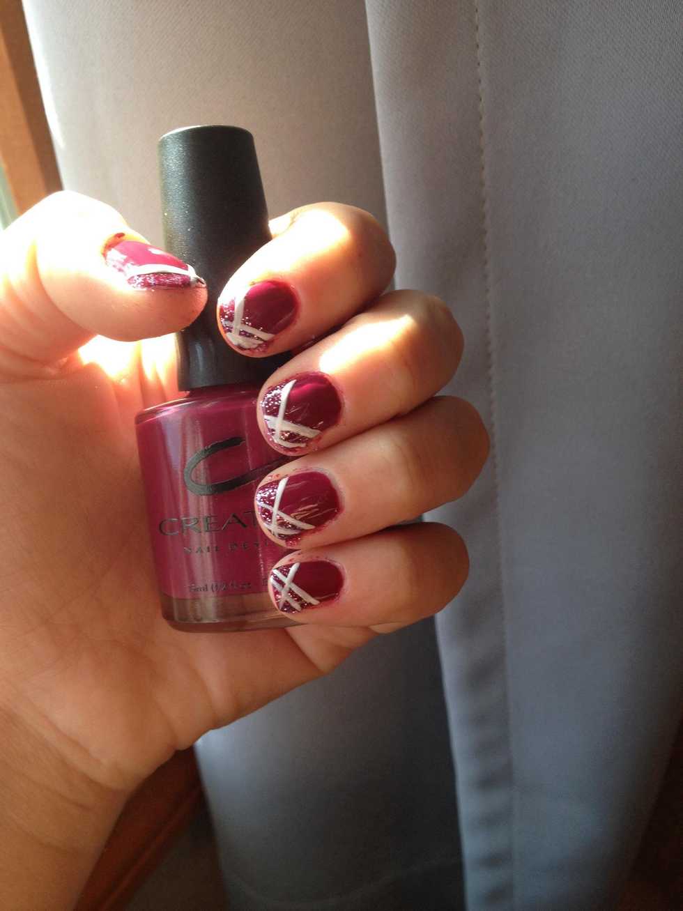 Paint nails dark pink, then paint tips with glitter polishUse white striper to create white stripes. Cover with favorite topcoat and enjoy!!