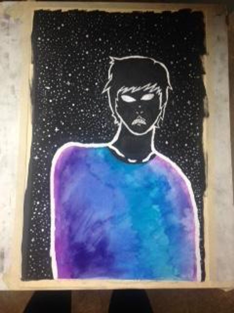 Start painting the part of the drawing with watercolor of your choice. I painted the shirt with blues, purples, and pinks