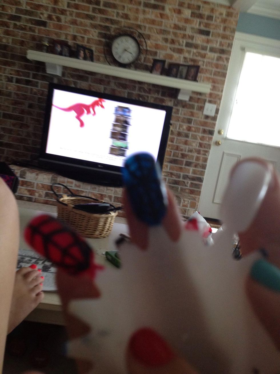 paint your nails blue and red alternating. (if doing for spiderman) you could also use white with a black web or black with a white web