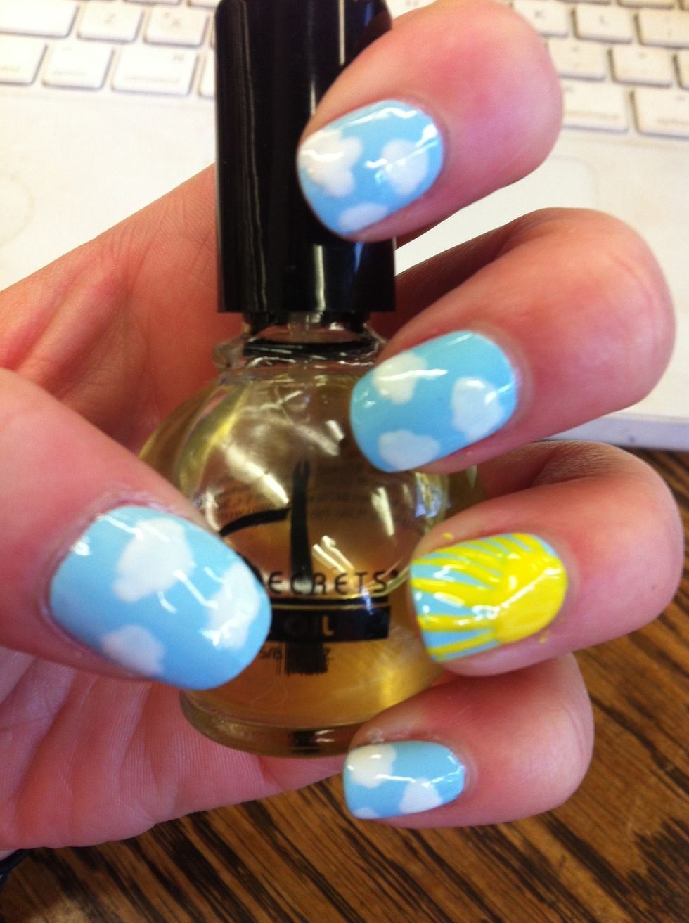 Use a dotting tool dipped in white polish to make fluffy cloud shapes on all your nails except one. These don't have to be perfect, just like real clouds!