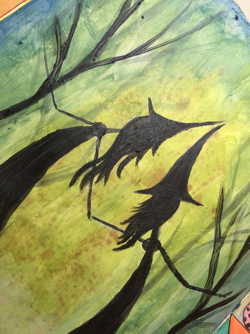Adding more trees with thicker Tuxedo Velvet and painting in my witch sisters.