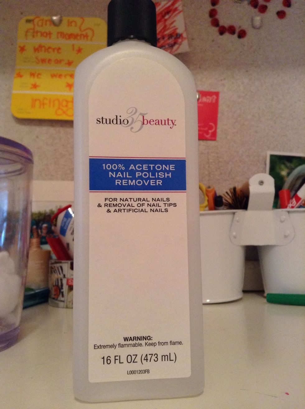 Then take off your old nail polish with nail polish remover. Remover can be found anywhere in stores.