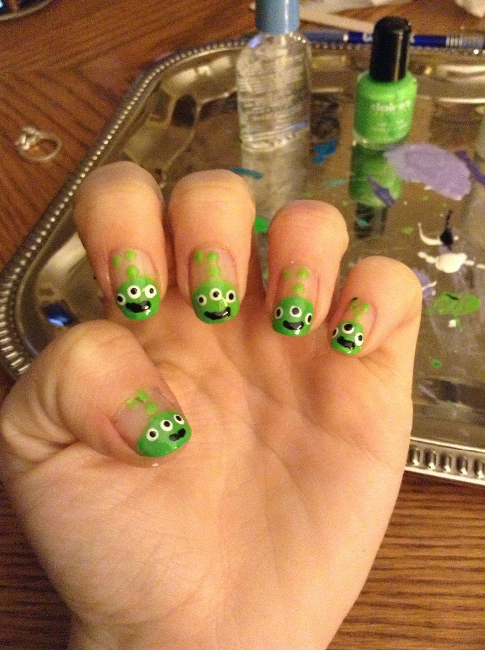 Fill the half circle in with the green polish. This may take two coats. This is the head of your alien.