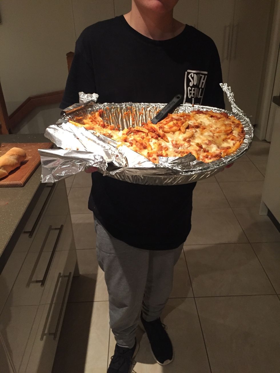 After all the ingredients are added to the tray, put in the oven for about 45 minutes at 180°c to bake.