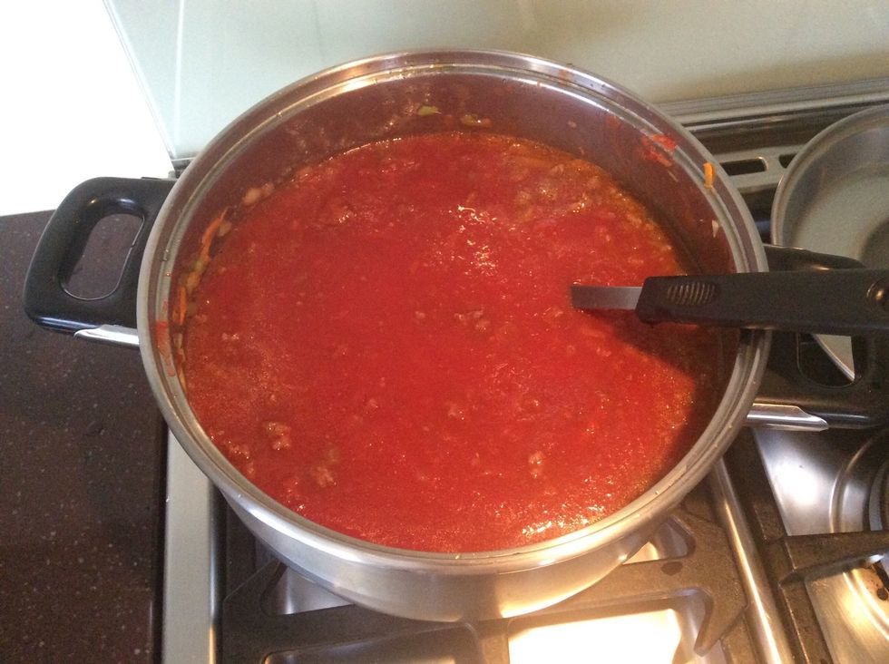 After adding the tomato paste, keep it to a low heat to cook for about an hour and a half. And salt to season.