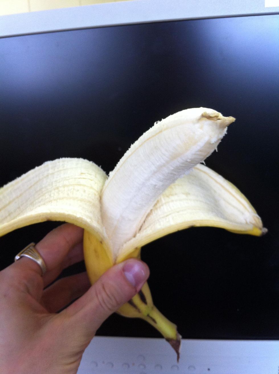 Take your banana this way upGrab the end without the stem between your index finger and your thumbPress hard until the end splits in halfPull apart the banana peel using two handsEnjoy your banana