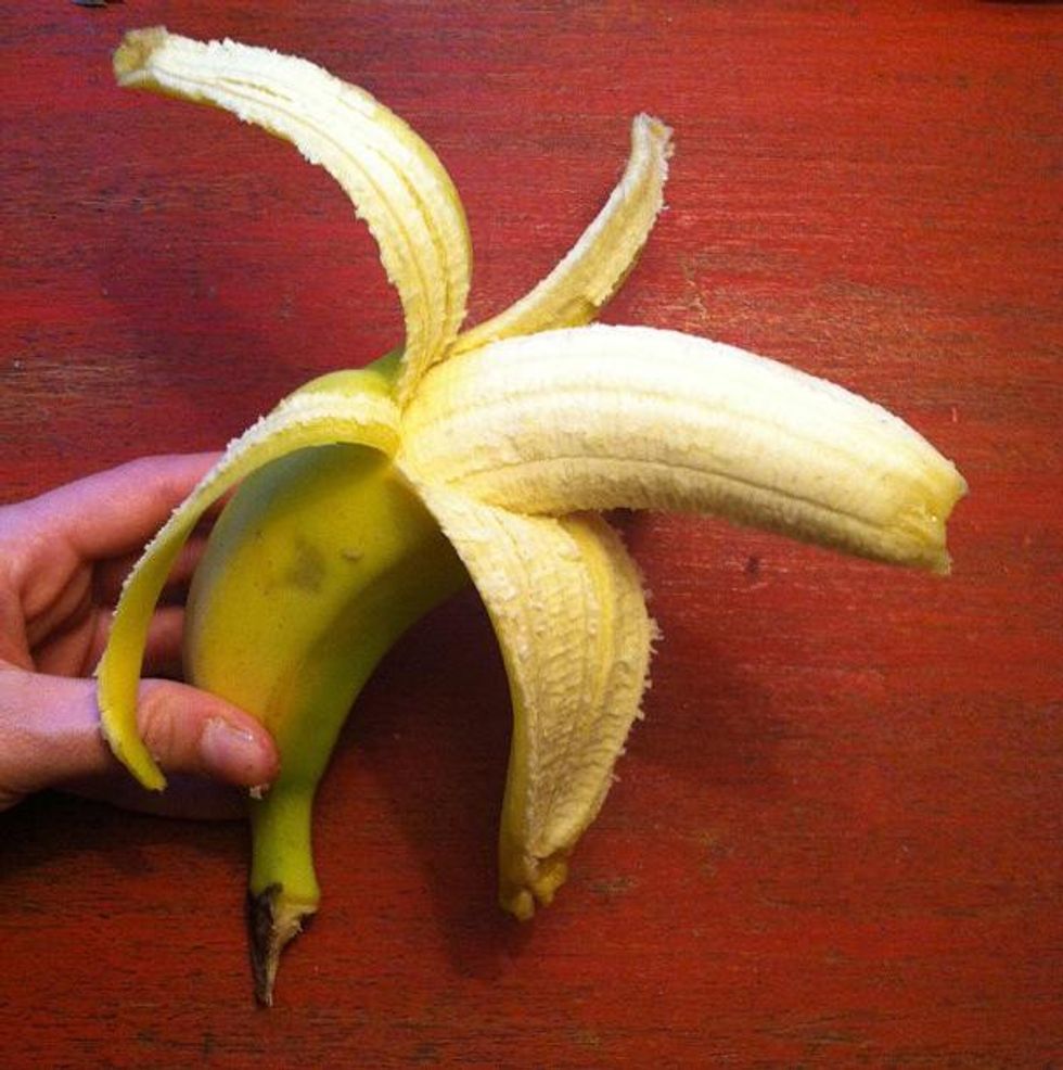 Secure a banana.Identify the bottom tip of the banana.Pinch the bottom tip. It should open very easily. No more struggling.Peel away.