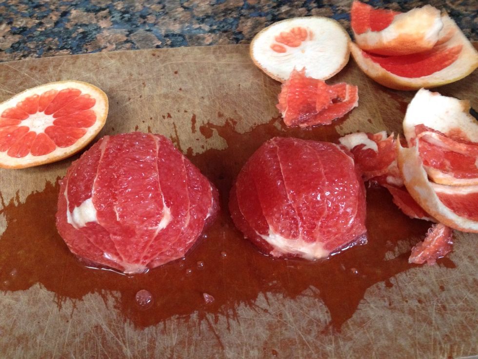Set the grapefruit on one flat end. Start at the top and cut off the peel, following the curve of the fruit.