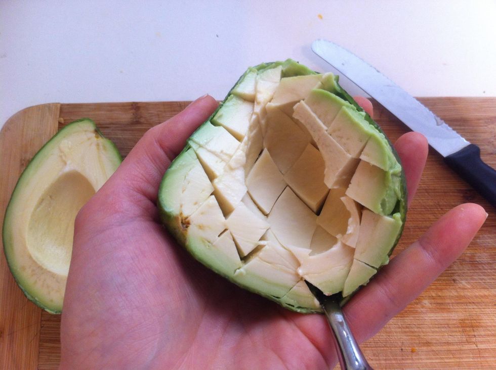 Carefully! Hold the avocado in one hand, cut the flesh into strips, go gently so you don't pierce the skin or yours! A blunt knife is a good idea when starting out!