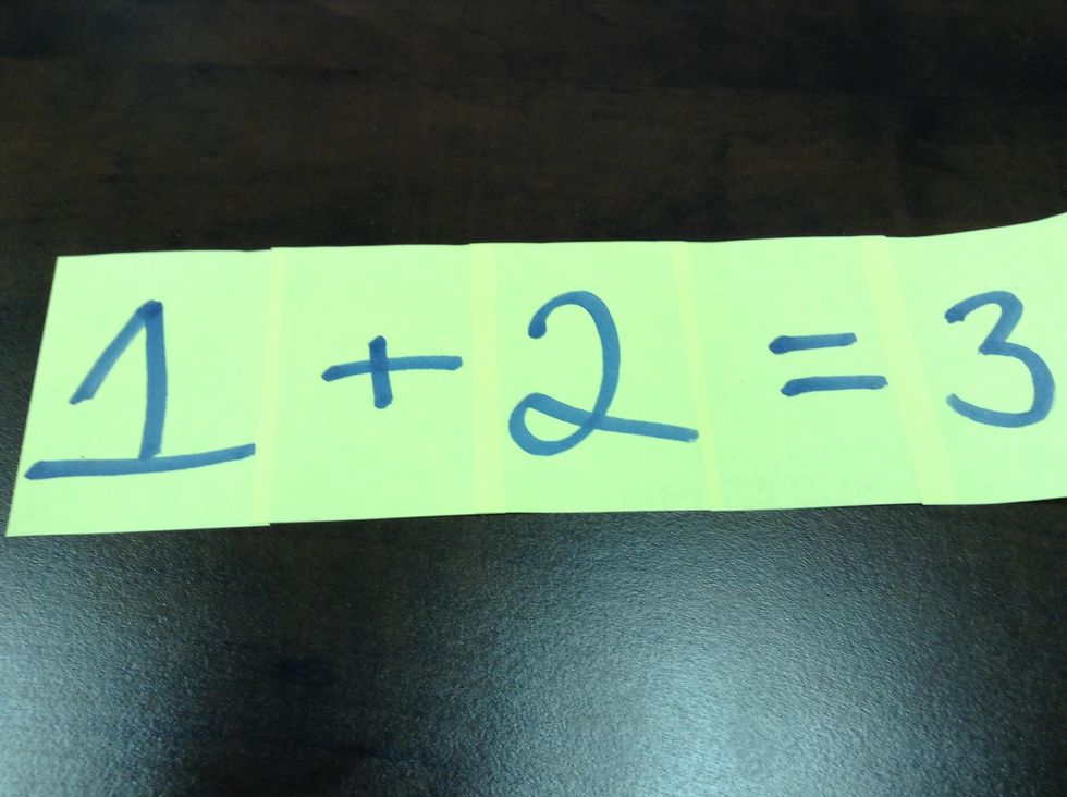 Begin with the number 1.This symbol means addition.We will add 2 to the 1 we began with.This symbol means that what follows must be equal to what came before (1+2).Beginning with 1 and counting up 2 gives us 3.