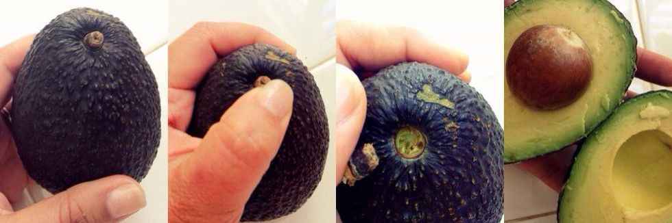 "If an avocado feels like your cheek, it is too ripe and chances are it is bruised"". When you push gently on an avocado, you want it to feel like the end of your nose– soft, but not too soft."