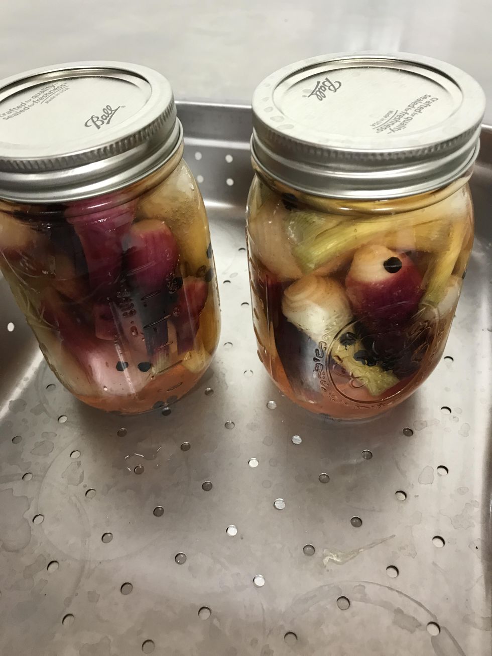 Top the onions with the Brine Mixture, Place the lids on the jars and hand tighten to leave a little room for air pockets.