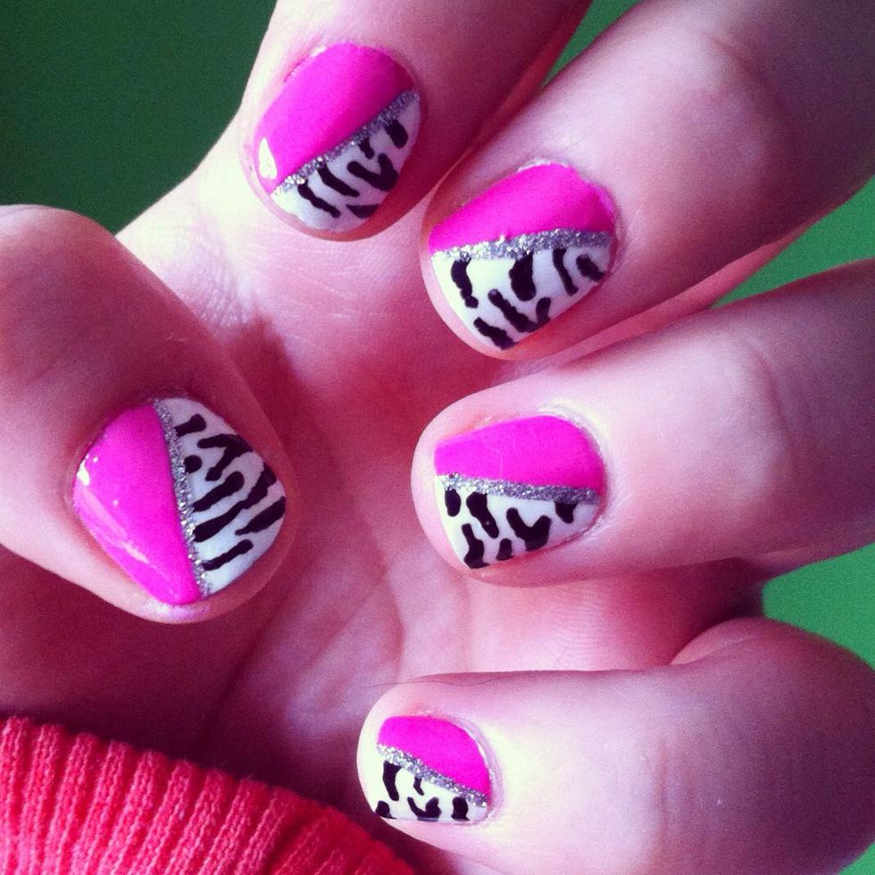 Once you're done, your nails should look like this. It doesn't matter if the lines are not that straight, cause we'll cover them later with the silver glitter nail polish.