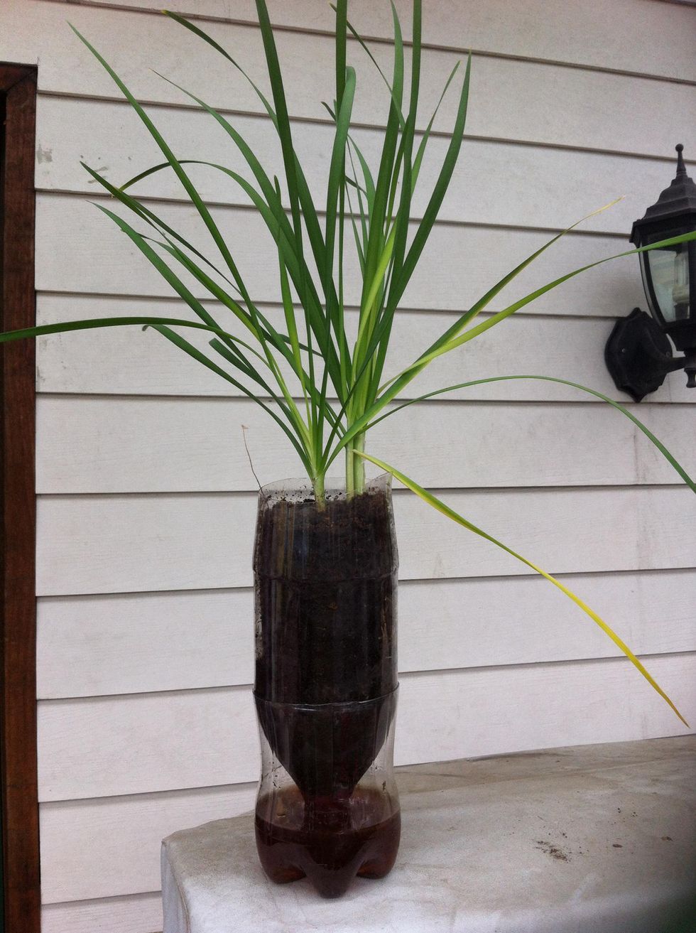 Pour the coco mixture into the plastic bottle half way, then place the plant on top of it, and fill the rest of the space with the mixture.