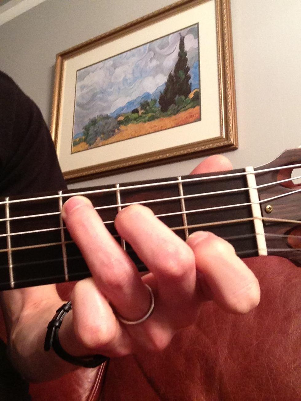 C - third fret A stringE - second fret D stringC - first fret B stringC chord notes: low - C - E - G - C - E - high