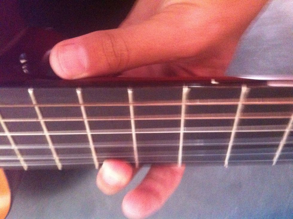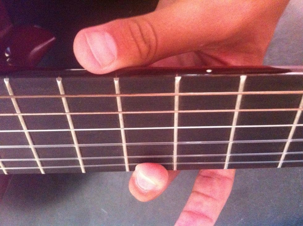 Then you pluck the second string from the bottom (While holding down 5th thread)
