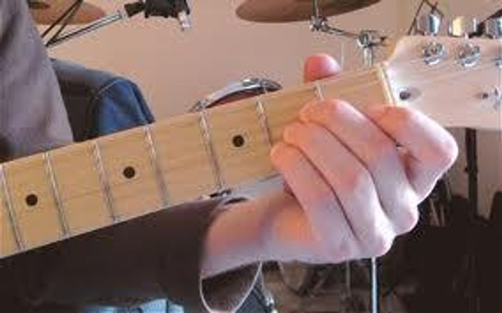 All fingers (left) will be on the second fret (between first $second metallic vertical lines). Place index finger on the 4rt string.. Strings are numbered 1-6 starting from the thinnest to thickest.