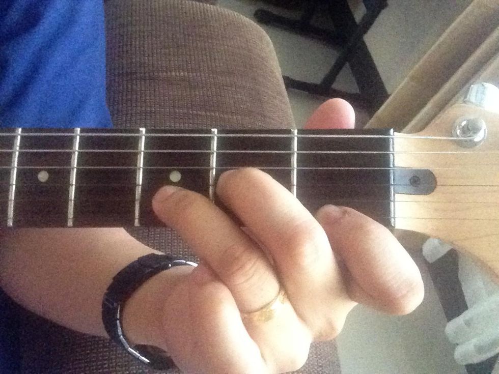 Next, put your middle finger on the second fret of the 3rd string from bottom/thinnest string. Always try to use the tip of the finger when fretting the strings.