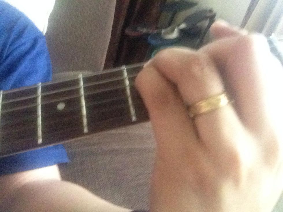 To play it, bar your first finger on the first fret. "Bar" means to lie down the finger in the first fret. Making sure that the 6th string (thickest) and first, second string to ring out when played