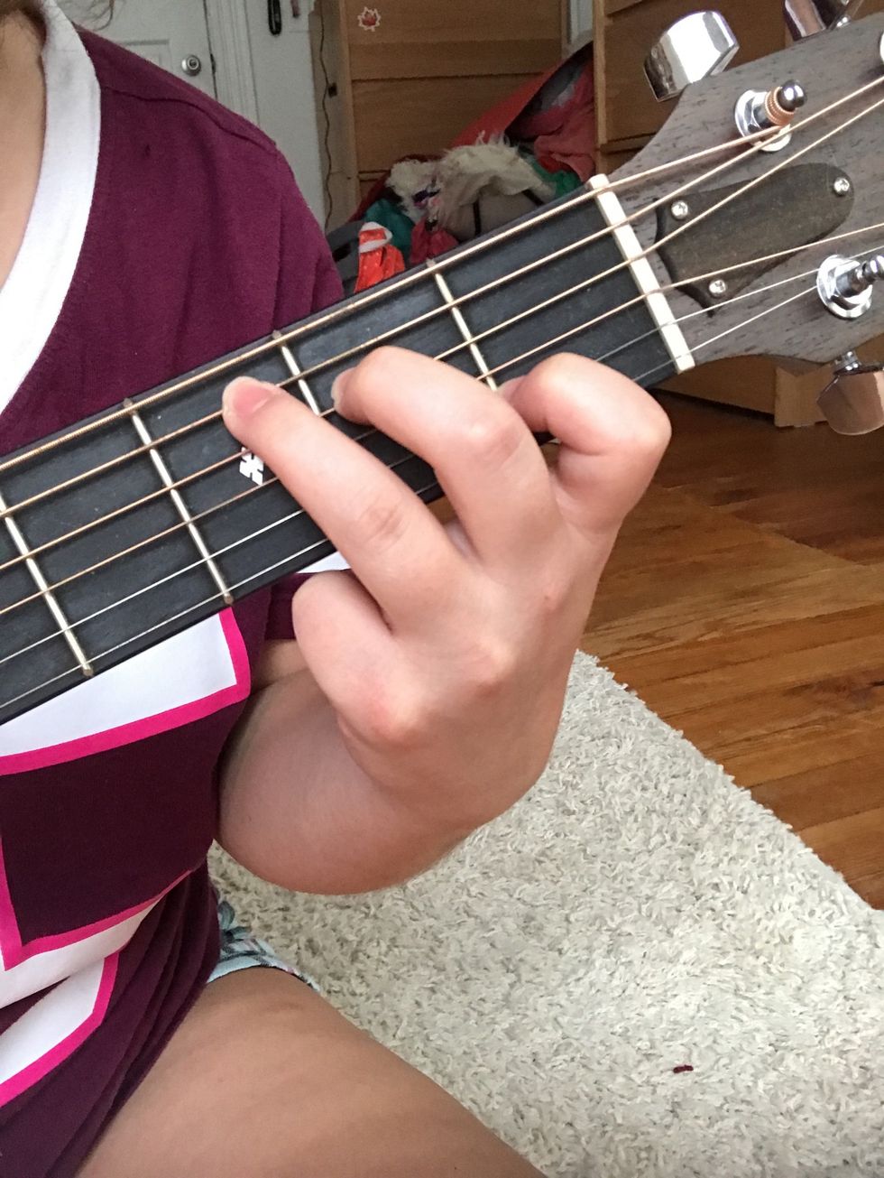 Put your pointer finger on the 5th string, 2nd fret. Your middle finger on the 6th string, 3rd fret. Your ring finger on the 1st string, 3rd fret. Press down. Make sure you're continuously strumming.