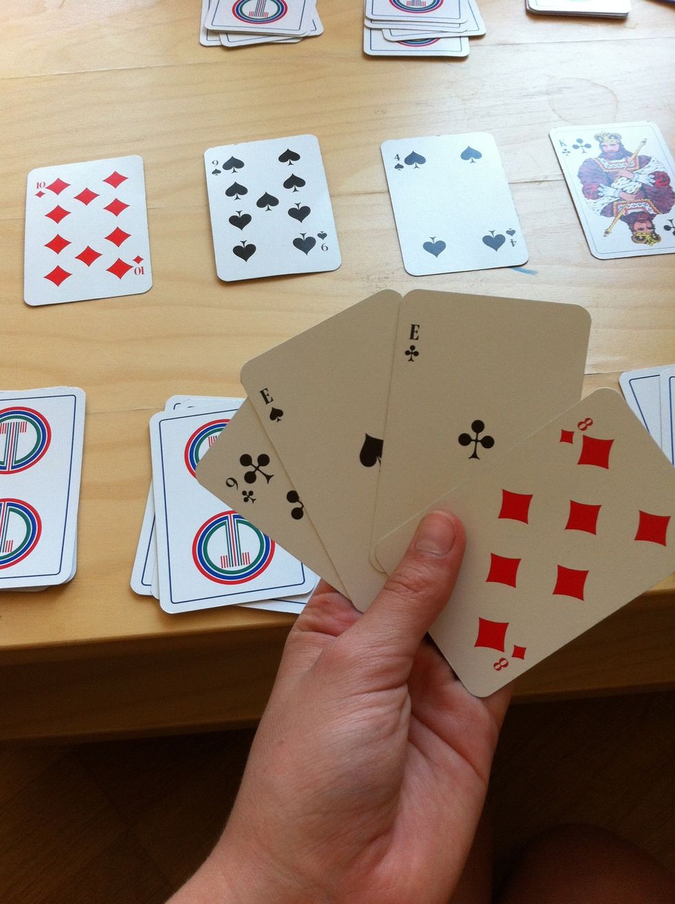 Then put the remaining four cards in the middle. If it is not even, you counted wrong or you are missing some cards.