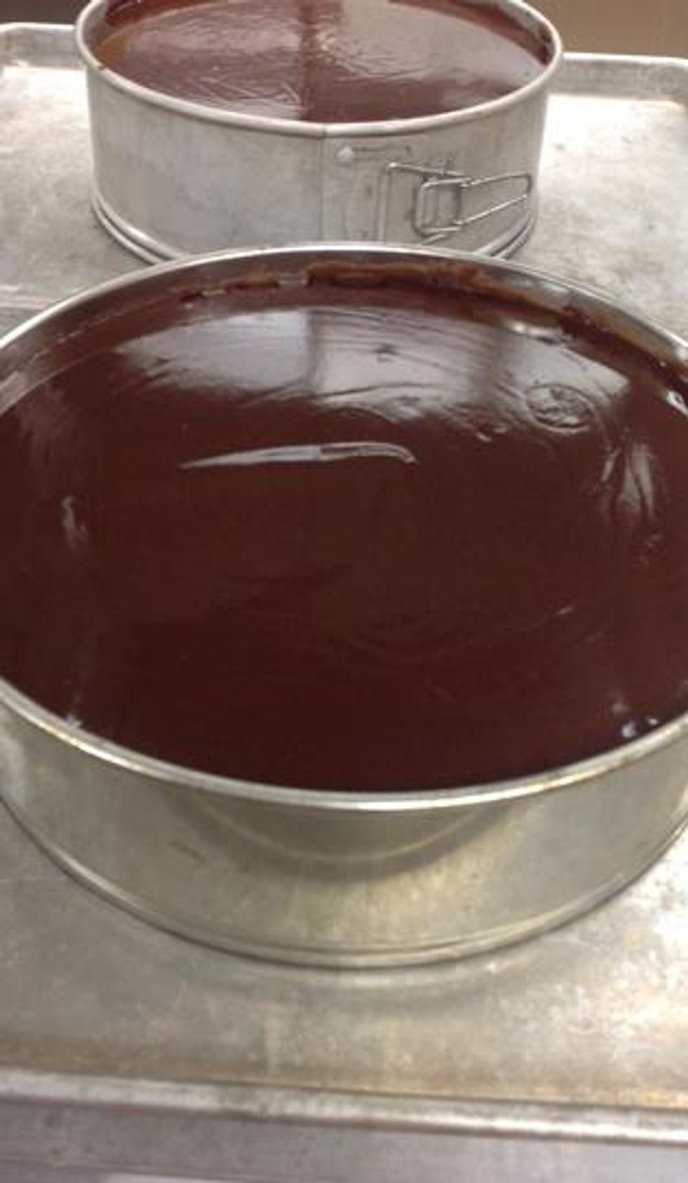 Once baked, mix melted chocolate and heavy cream together and place on top of cooled cheesecakes.