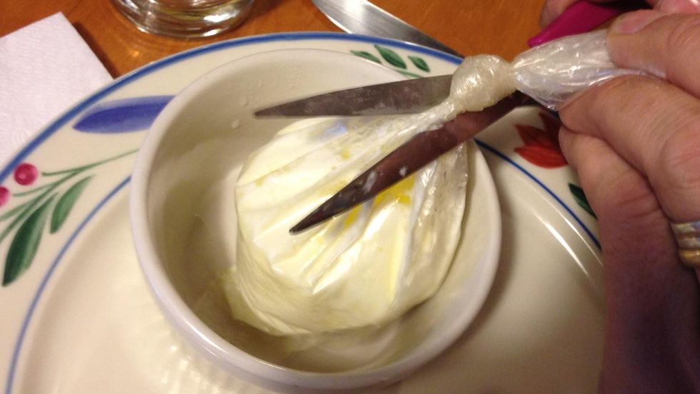 Now, where's that ramkin? Plop the eggs into the dish. Cut off the knot, and pull the bag out, letting everything slide into the dish.
